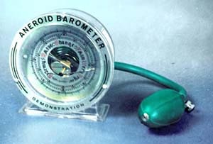 | Aneroid Barometers : With 100 mm dial graduated 28 to 31 inch of mercury and 960 to 1060 millibars. With plated bezel, cover glass and index polished wooden base approx. 16 cm dia. | |