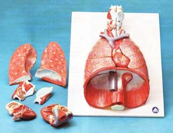 : Life size,7 parts. This model presents the lungs with two removable lobes and major veins and arteries, larynx(2 parts), heart(2parts), diaphragm.
