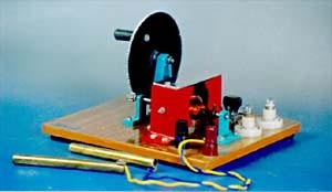 : A cycle dynamo mounted on a wooden base 200 x 115 x 12 mm. and provided with two sets of gears driven by a hand crank for fast or slow rotation