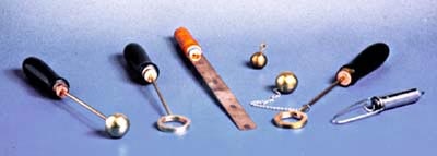:An apparatus for demonstrating thermal expansion, comprising a capative brass ball secured to a mounted brass ring by a chain. Ball dia. 25 mm.